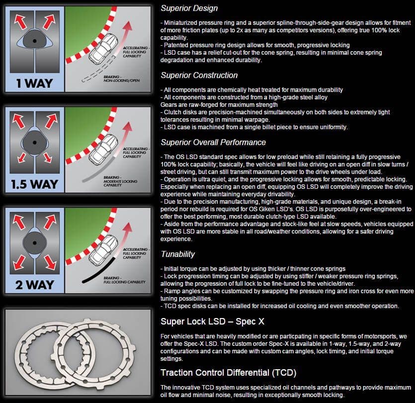 1. Lock Timing Technology " under normal driving conditions, the OS Giken LSD acts just like any normal differential. Once full power is applied, it turns into a true 100% locking unit. However, unlike other clutch type differentials, what separates the OS Giken from others is how smoothly this transition is performed. In addition, due to unique gear driven centre section, the OS Giken differential is extremely responsive, allowing it to transition from lock to unlock instantly.
